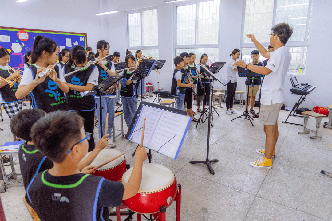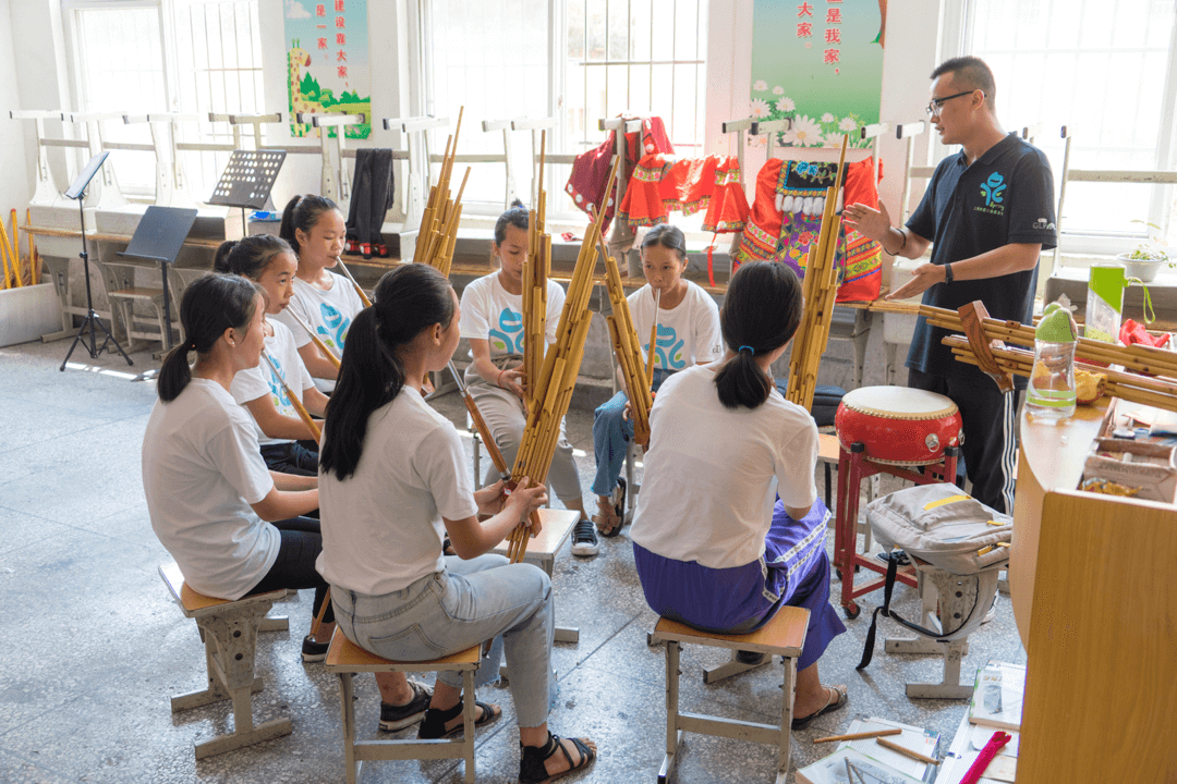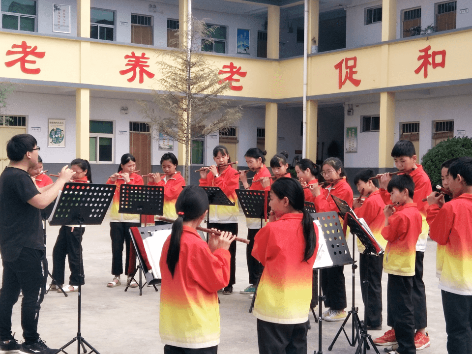 在“快樂學習音樂”的教學理念指導下,為3-6 年級或7-9 年級學生提供免費的義務(wù)音樂服務(wù)。同時開設(shè)笛子團、鼓團、管樂團、二胡團、揚琴團等,在課余時間對音樂感興趣的學生進行授課。挖掘鄉(xiāng)村地區(qū)學生們的創(chuàng)造性潛能,增進對世界音樂文化多樣性的理解,增強溝通交流能力,傳承民族優(yōu)秀文化。英語