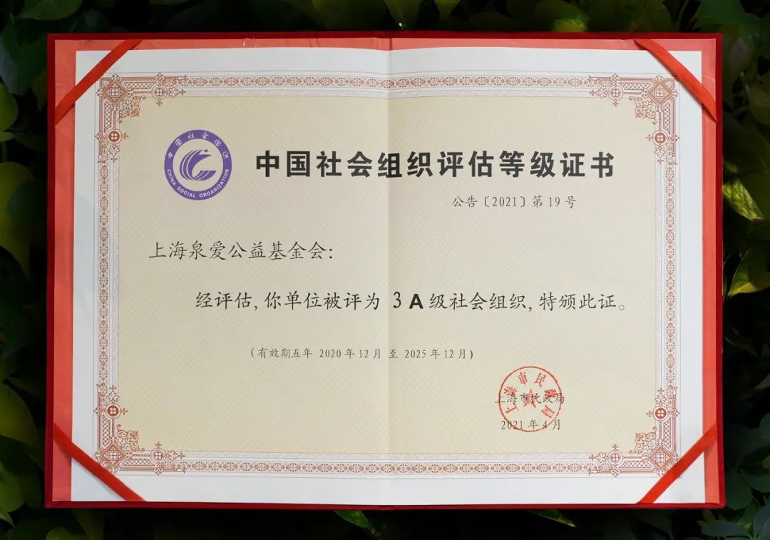 各級民政部門對社會組織,即登記注冊的社會團體、基金會、民辦非企業(yè)單位,依照規(guī)范的方法和程序,由評估機構(gòu)根據(jù)評估標(biāo)準(zhǔn),進行客觀、全面的評估,并確認其社會組織等級。根據(jù)《社會組織評估管理辦法》(民政部令第39號)有關(guān)規(guī)定,經(jīng)過評估機構(gòu)初評,上海市社會組織評估委員會審議,“上海民政”、 “上海社會組織公共服務(wù)平臺”網(wǎng)上公示,上海泉愛公益基金會在2021年度被評為“3A(AAA)級社會組織”。