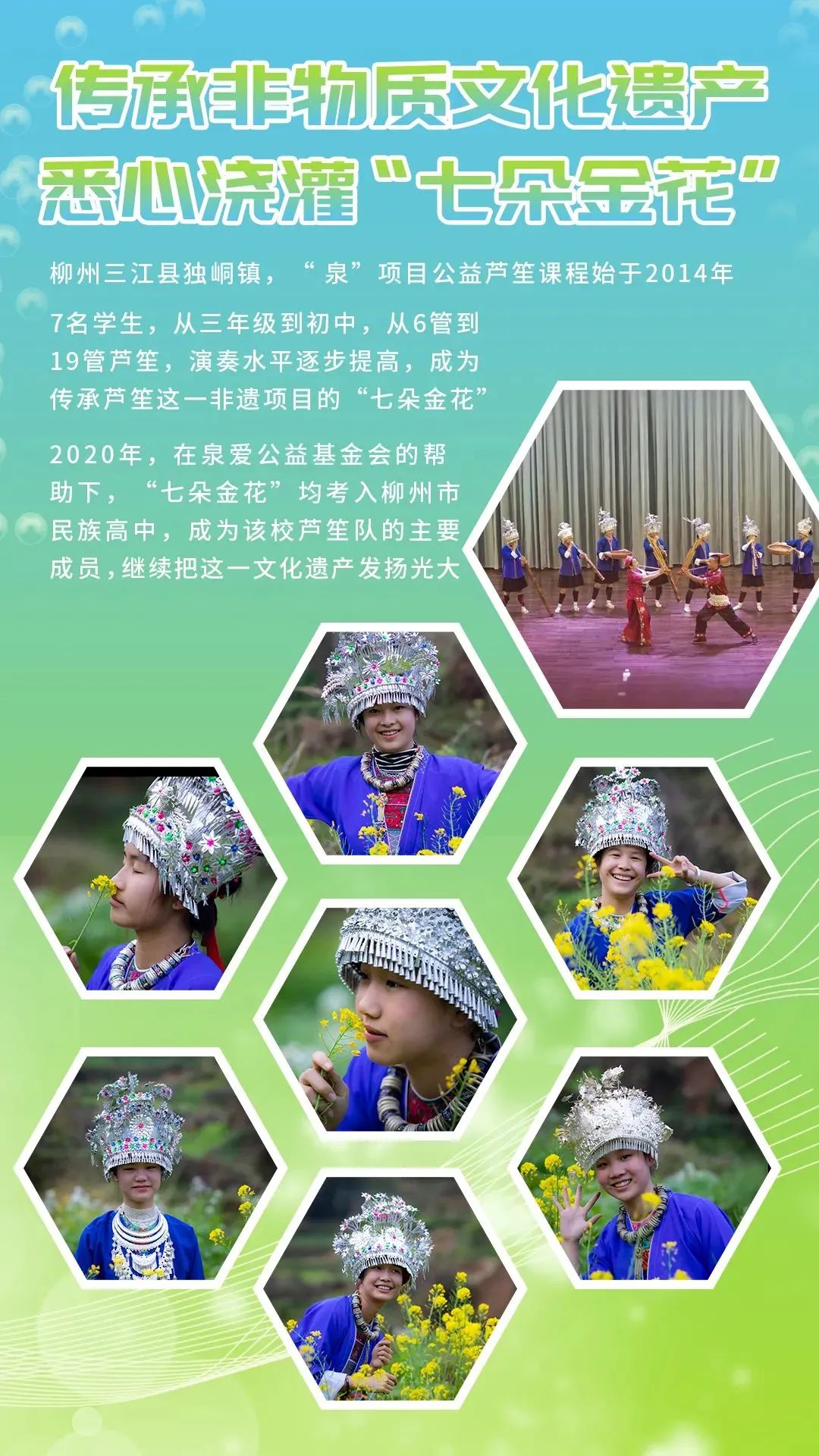 同樣,自“泉”項目2014年進入柳州三江縣獨峒鎮(zhèn)開展公益蘆笙課程以來,也受到了當(dāng)?shù)貙W(xué)生和家長歡迎。其中有7名學(xué)生從3年級開始就跟隨“泉”項目學(xué)習(xí)蘆笙。從小學(xué)到初中,從6管到19管蘆笙,伴隨著汗水,這些同學(xué)的演奏水平逐步提高,經(jīng)常參加市縣舉辦的各類文藝活動并獲得優(yōu)異成績,成為蘆笙這一非遺項目傳承的“七朵金花”。她們在泉愛基金會的幫助下,于2020年8月一起考入柳州市民族高中,共同成為該校蘆笙隊的主要成員,從而有機會繼續(xù)把這一文化遺產(chǎn)發(fā)揚光大。