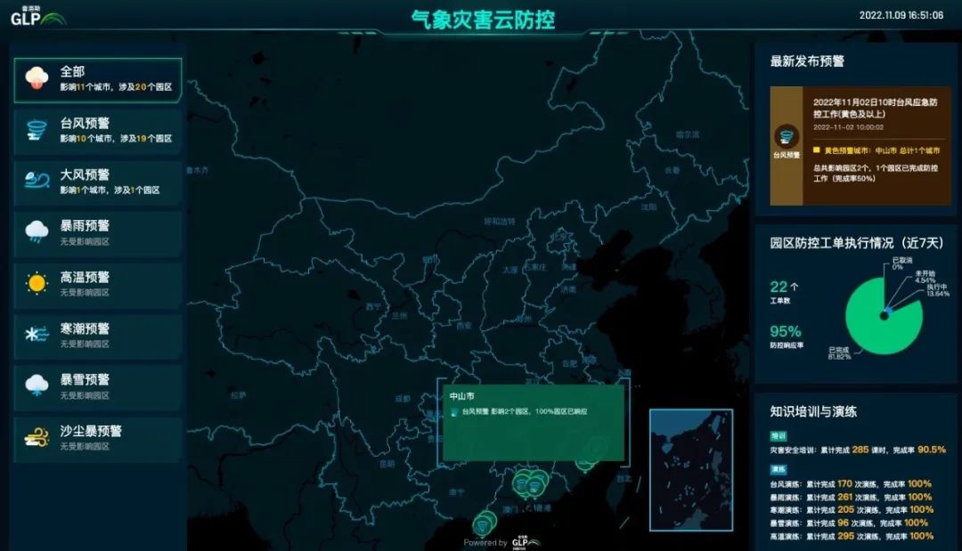 在白皮書中總結了物流園區運營8大風險要素,梳理了園區公共道路、安防、消防、公用設施及能耗管理、月臺、庫內、公共衛生7大風險管理場景。基于上述場景,普洛斯ASP運用物聯網、大數據、人工智能等科技,以智能運營中心(IOC)作為園區實施科技運營的核心載體,接入園區的安防、消防、運維、能耗管理、智能化視頻等系統,并且推出氣象災害云防控、突發事件管控平臺、運維監測和消防監控、“智慧風險一張圖”等一系列智慧化解決方案,實現了物流園區全面數字化管理、網絡化協同,智能化管控水平大幅提升。