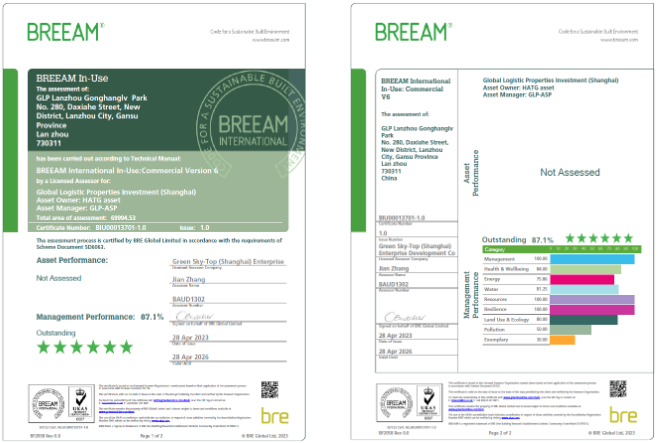 甘肅公航旅金融倉儲基地BREEAM In-Use“杰出”級認證證書