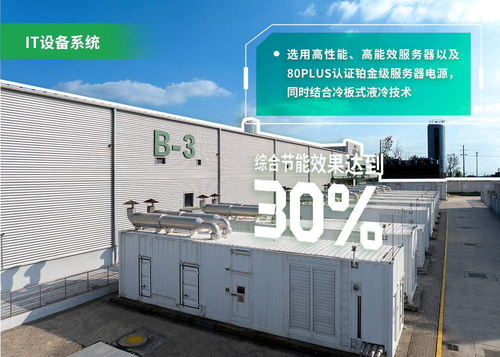 在IT設備方面,項目選用高性能、高能效服務器以及80PLUS認證鉑金級服務器電源,同時結合冷板式液冷技術,綜合節能效果達到30%-40%;